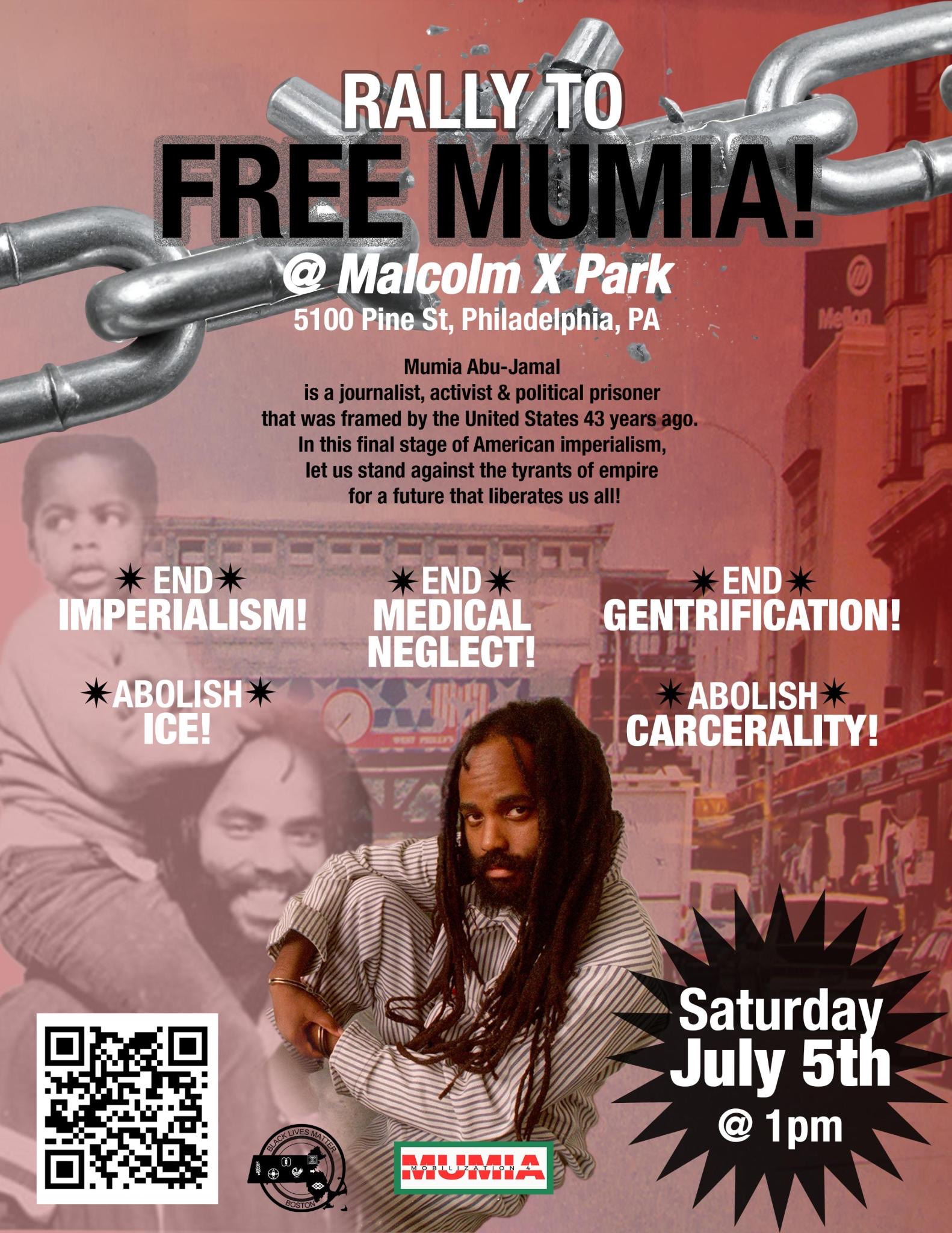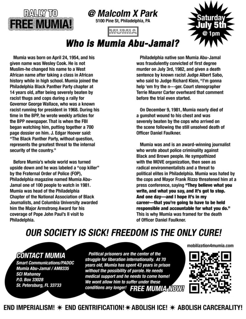 A West Philadelphia rally and march for Mumia Abu-Jamal is being planned for the afternoon of Saturday, July 5, 2025, to commemorate the anniversary of his unjust 1982 conviction.